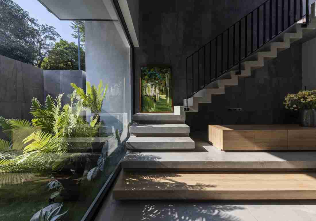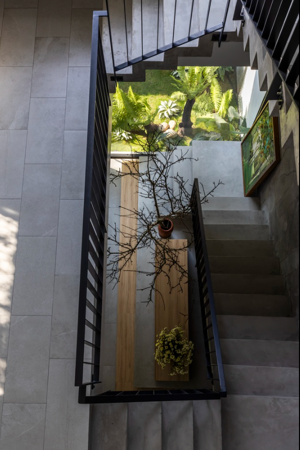 Cầu thang bê tông tay vịn sắt hài hòa với bố cục chung của ngôi nhà. Thiết kế mạch lạc với cấu trúc hiện đại thông qua các đường đi, một khu vườn nhỏ gọn và không gian xanh xen kẽ.
