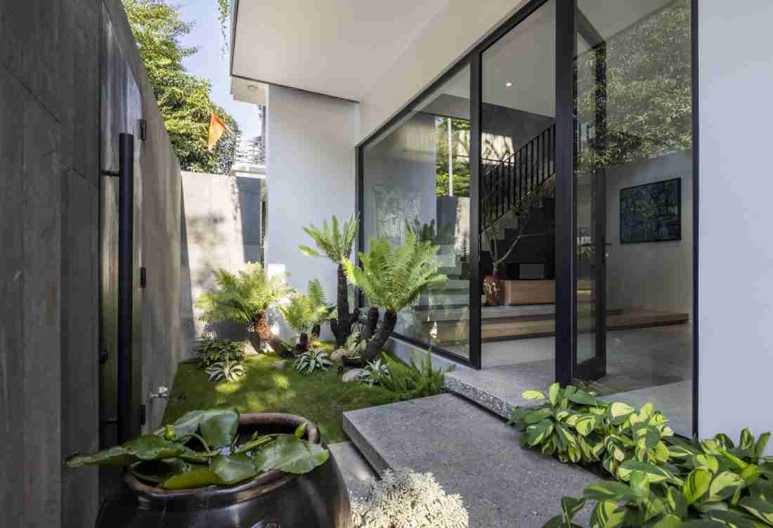 Khoảng sân vườn bố trí cây xanh ngay lối vào phòng khách sau khi cải tạo.
