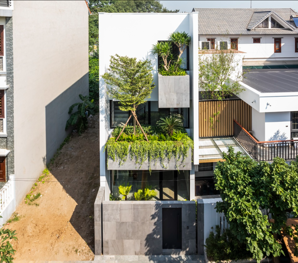 Bên cạnh những điểm bất lợi thì ngôi nhà đi kèm một số thuận lợi từ không gian xung quanh mở và cây xanh chưa được khai thác, nên kiến trúc sư đã tạo ra những khu vườn treo liên kết với mặt tiền.