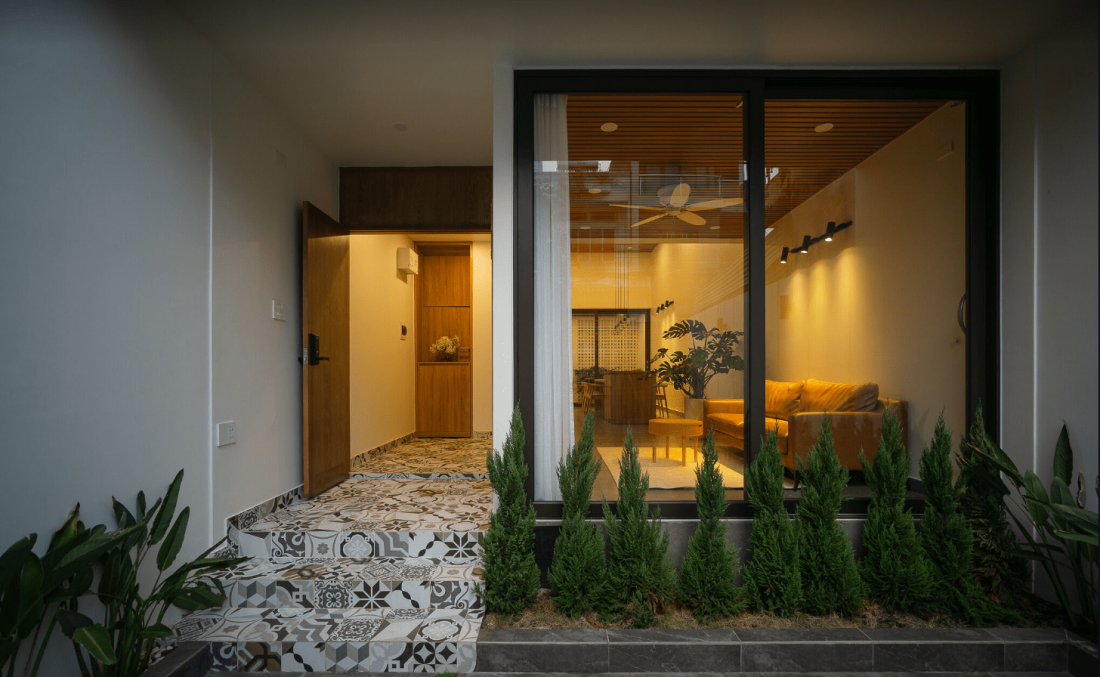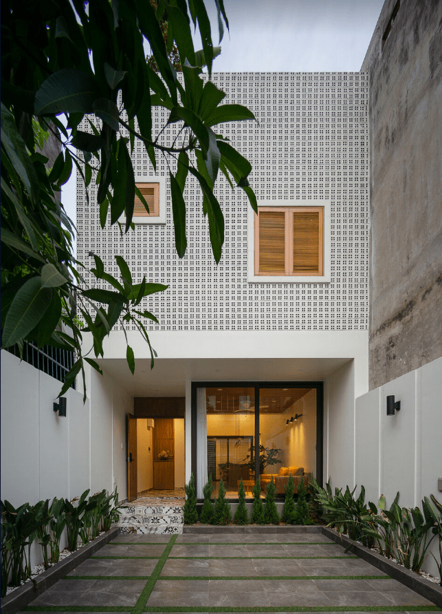 Mặt tiền sử dụng gạch ống lỗ sơn trắng kết hợp với cửa các ô cửa lá sách đảm bảo tính riêng tư đồng thời giúp thông gió tự nhiên và mang đến tầm nhìn bao quát từ bên trong.