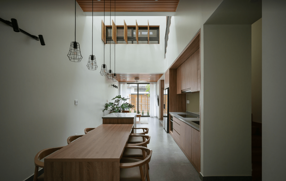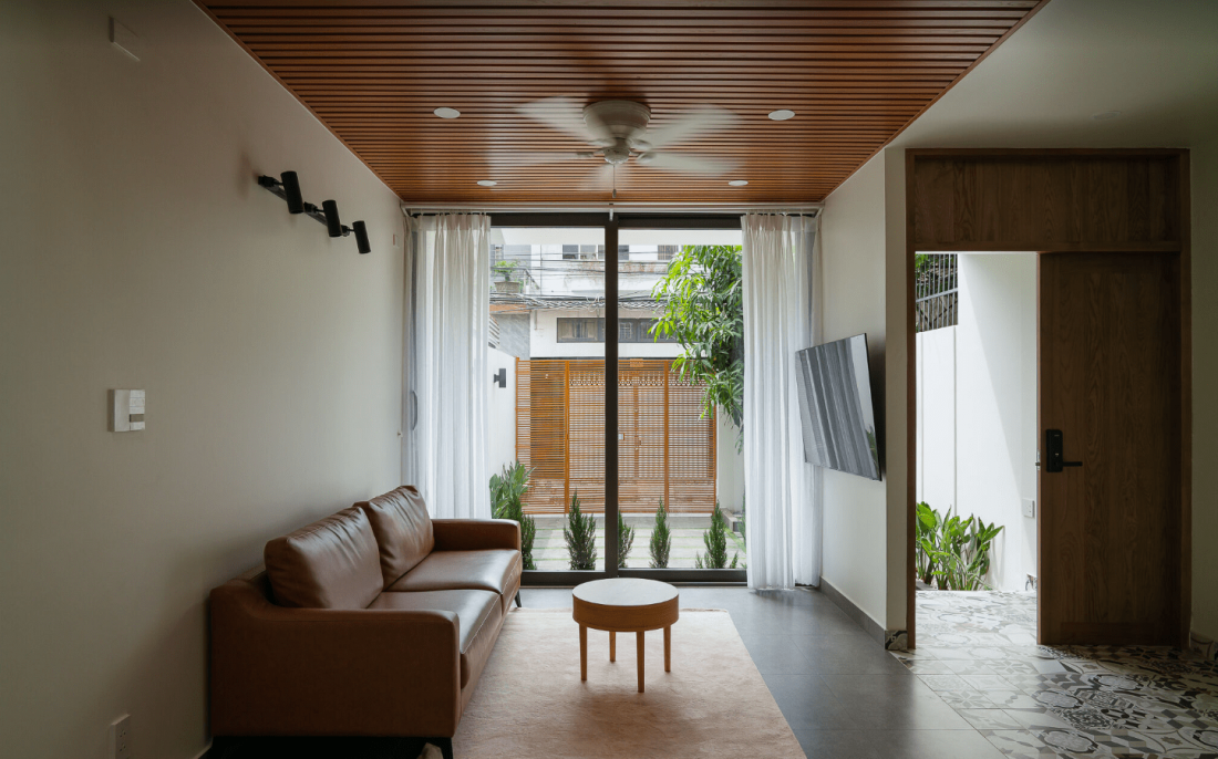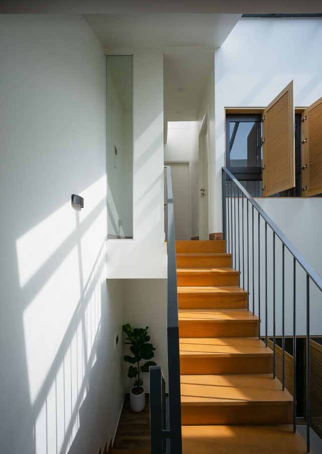 Giếng trời được đặt ở trung tâm nhà với chức năng điều hòa không khí trong và ngoài. Khi kết hợp với hệ cửa gỗ lá sách tạo sự riêng tư và thông thoáng.