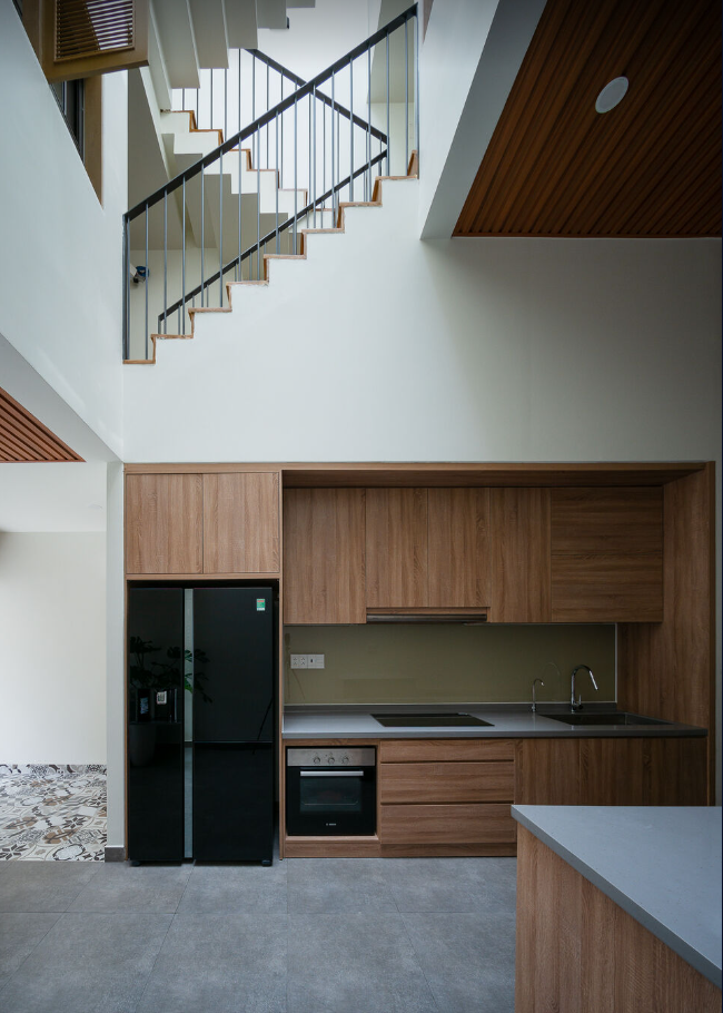 Ngôi nhà được thiết kế lệch tầng về phía sau tuy nhiên khi nhìn bên ngoài chỉ 2 tầng do bên trong chiều cao đã được nâng lên thành 3 tầng, tạo nên sự kết hợp tuyệt vời với những ngôi nhà khác. Hơn nữa căn bếp được cải tạo không chỉ theo nhu cầu của gia chủ mà còn đóng vai trò giúp bố mẹ dễ dàng quan sát trẻ ở phòng ngủ phía tầng trên.