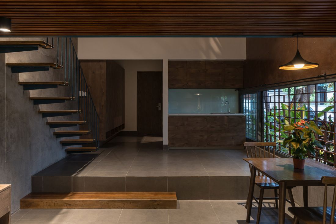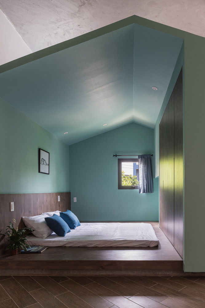 Nếu các tầng dưới thể hiện sự năng động trẻ trung thì 2 căn hộ áp mái lại thiên về sự mộc mạc và tối giản. Gác xếp có mái ngói truyền thống khoe kết cấu kèo, nhìn ra vườn treo chạy dọc nhà mang đến cảm giác như đang ở penthouse mini.