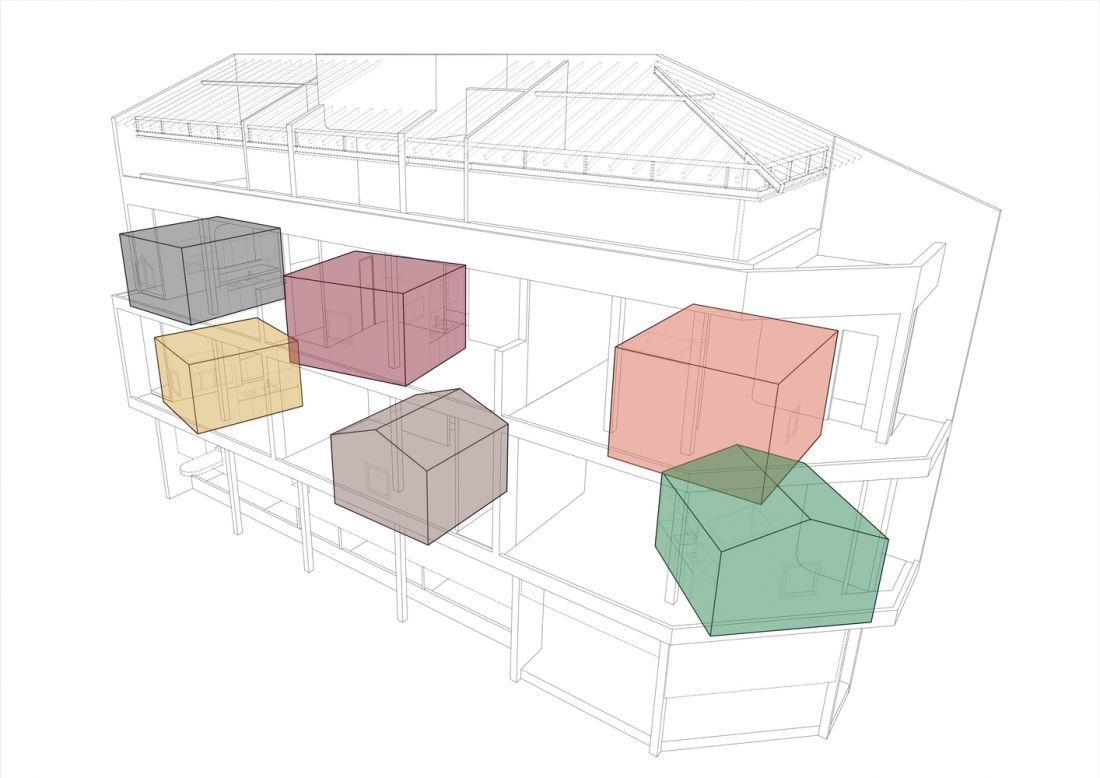 Những khối phòng nhiều màu sắc xoay theo nhiều hướng khác nhau tạo nên sự chuyển động mạnh mẽ, góp phần che đi những cột bê tông và kết cấu cũ của ngôi nhà.