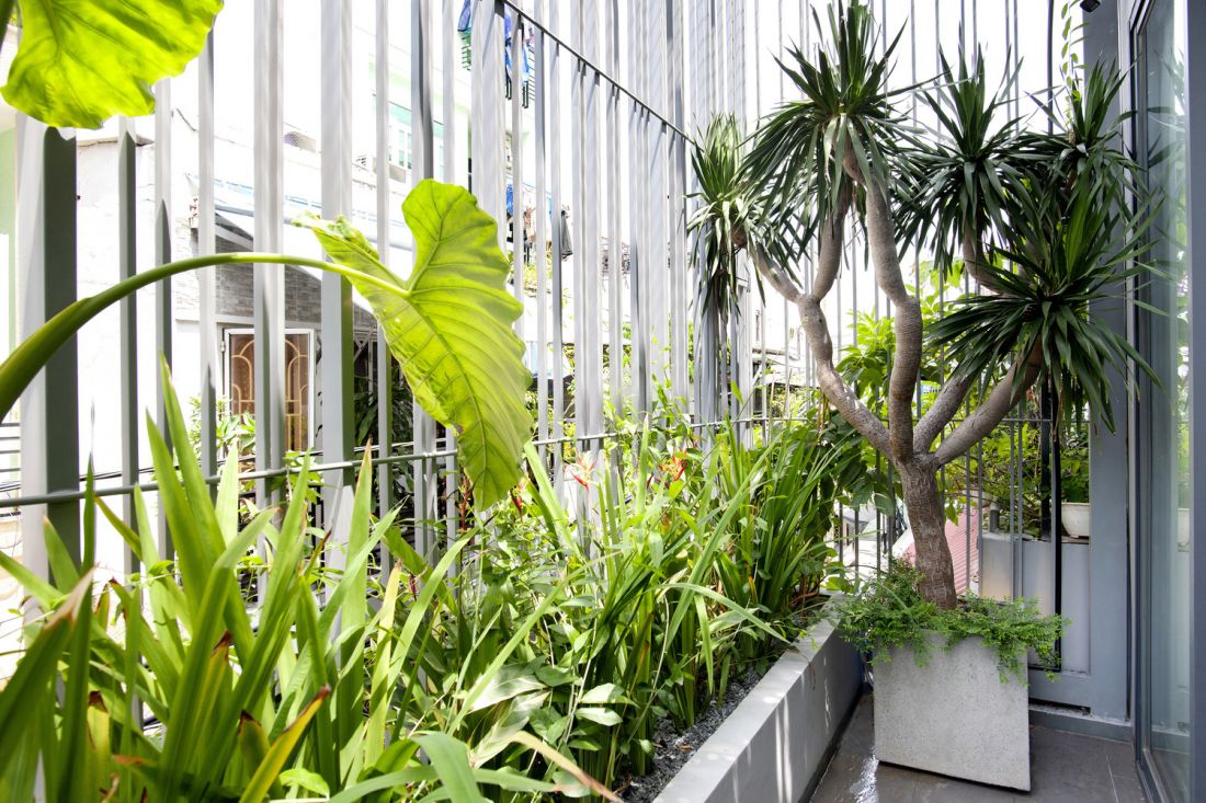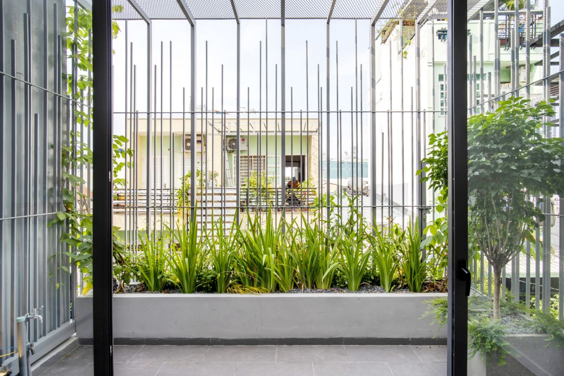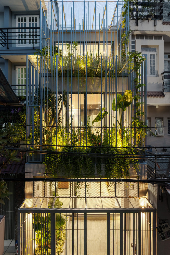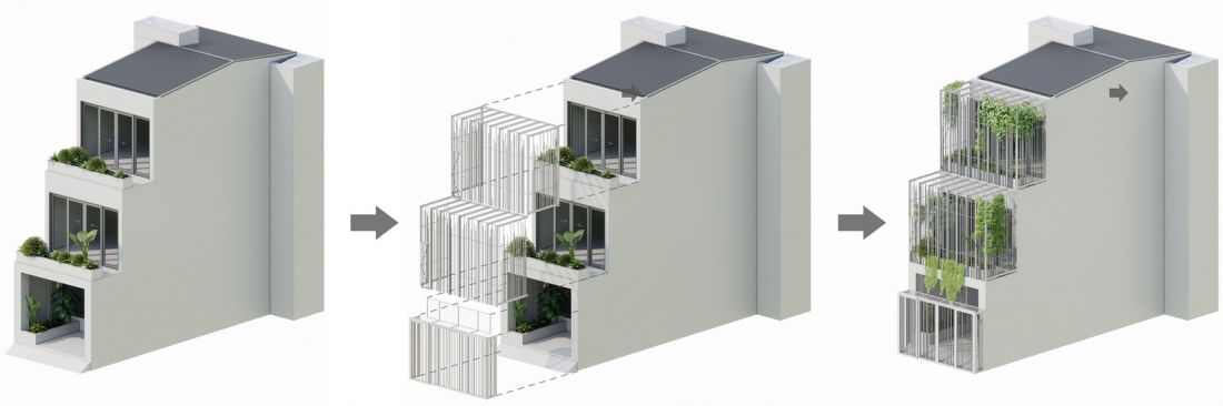 Thứ hai, toàn bộ mặt tiền cũ đã được gọt đẽo cẩn thận, sau đó gắn thêm hệ lồng sắt giật cấp có cấu tạo từ các thanh sắt hộp thanh mảnh với khoảng cách biến thiên kết hợp với giàn dây leo bên trên.