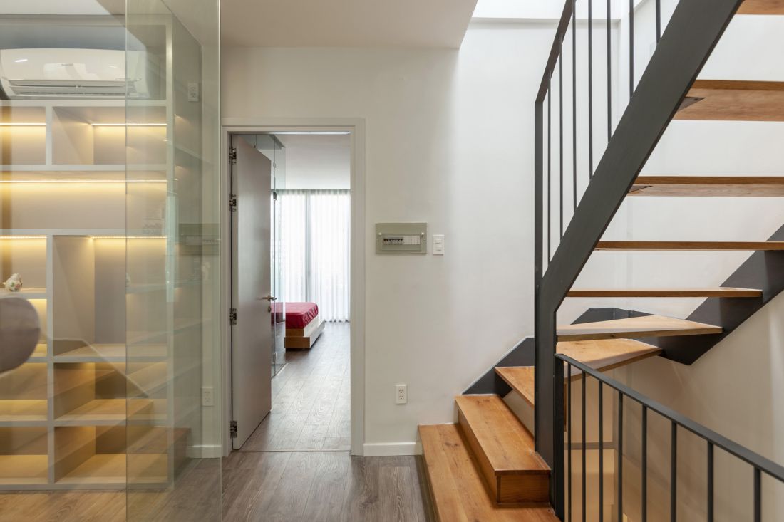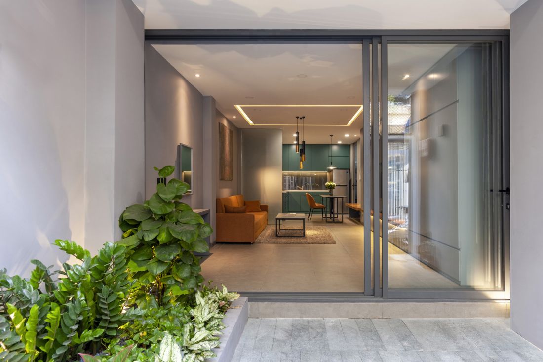 Trong khi đó không gian phía trước được dành cho khu vực sinh hoạt chung, sảnh chính và khoảng sân vườn. Phòng ngủ chính và phòng tắm được di dời ra phía trước của tầng hai và được hoàn thiện bằng kính lớn, sàn gỗ nhiều lớp. Kế đến là phòng làm việc được bố trí ở phía sau có ánh sáng ban ngày dịu mát từ ô giếng trời.