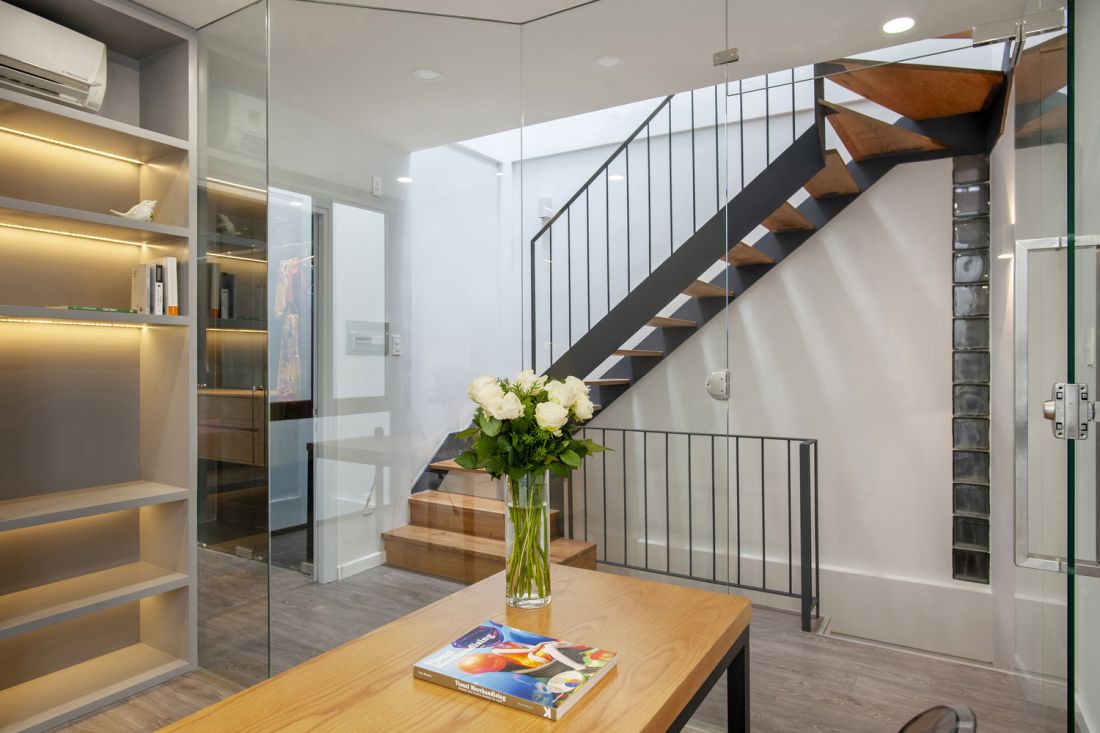 Đầu tiên, cầu thang bê tông giữa nhà được thay thế bằng cầu thang có chất liệu nhẹ làm bằng khung sắt và các thanh gỗ mảnh dưới một ô giếng trời; thêm một ô giếng trời thứ hai ở góc phía sau nhà để cung cấp ánh sáng ban ngày thông thoáng cho căn bếp và khu vực ăn uống ở phía sau của tầng trệt.