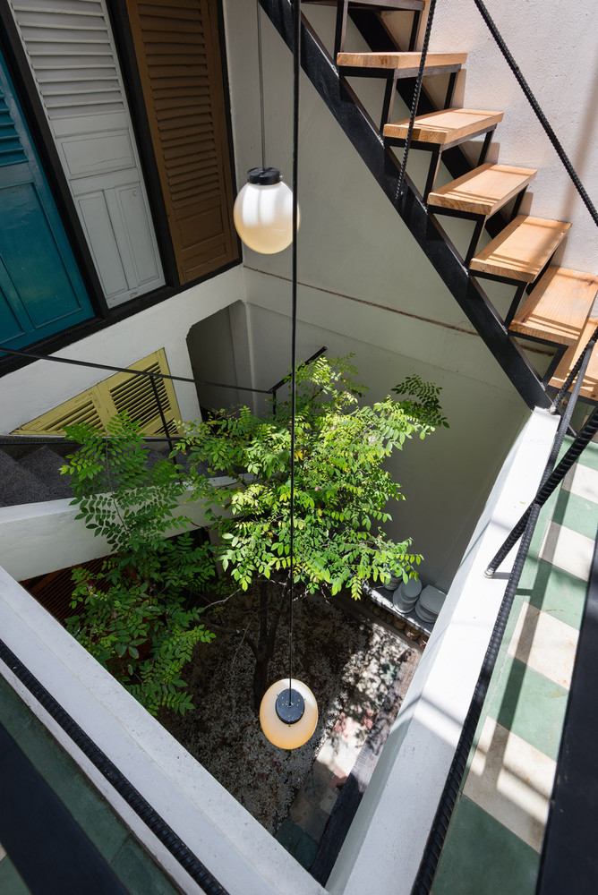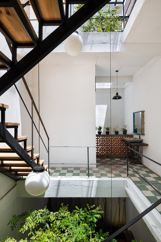 Xen kẽ giữa hai không gian này là khu vườn và một cầu thang cũ lên tầng 1. Tầng 1 bố trí phòng ngủ phía trước vừa là nơi thư giãn vừa là nơi làm việc. Một cầu thang thép mới được dựng bên cạnh giếng trời lên tầng 2, nơi đây từng là mái nhà không sử dụng.