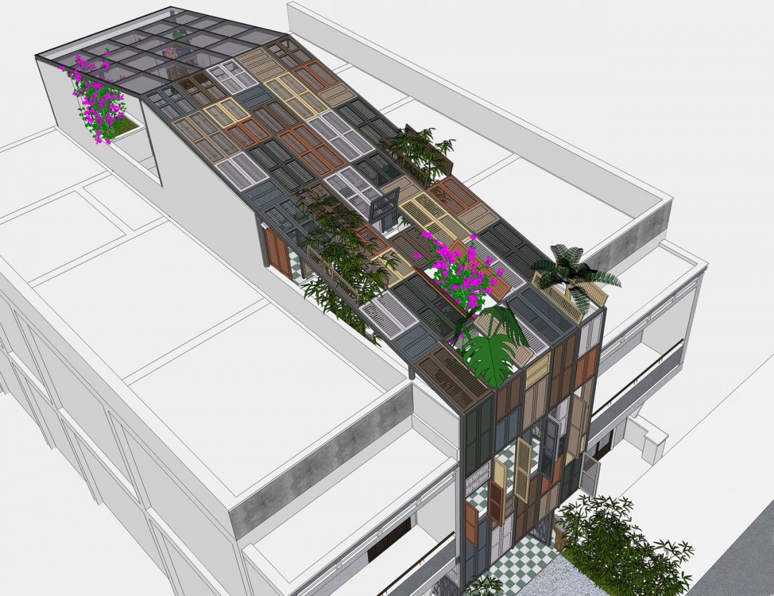 Giải pháp bố trí các cánh cửa tái chế cho phần mái ngôi nhà
