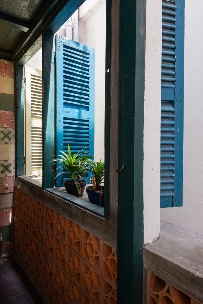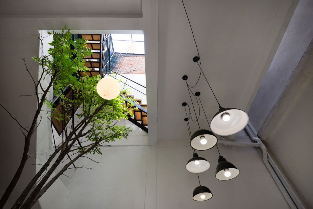 Vật liệu của tường và sàn nhà vẫn được giữ nguyên. Các bề mặt xi măng chưa qua tinh chế, những khung cửa sổ lá xách và phên tre trên trần tạo nên một không gian vừa hiện đại vừa cổ kính, đồng thời làm sống lại kiến trúc Việt Nam những năm 60-70.