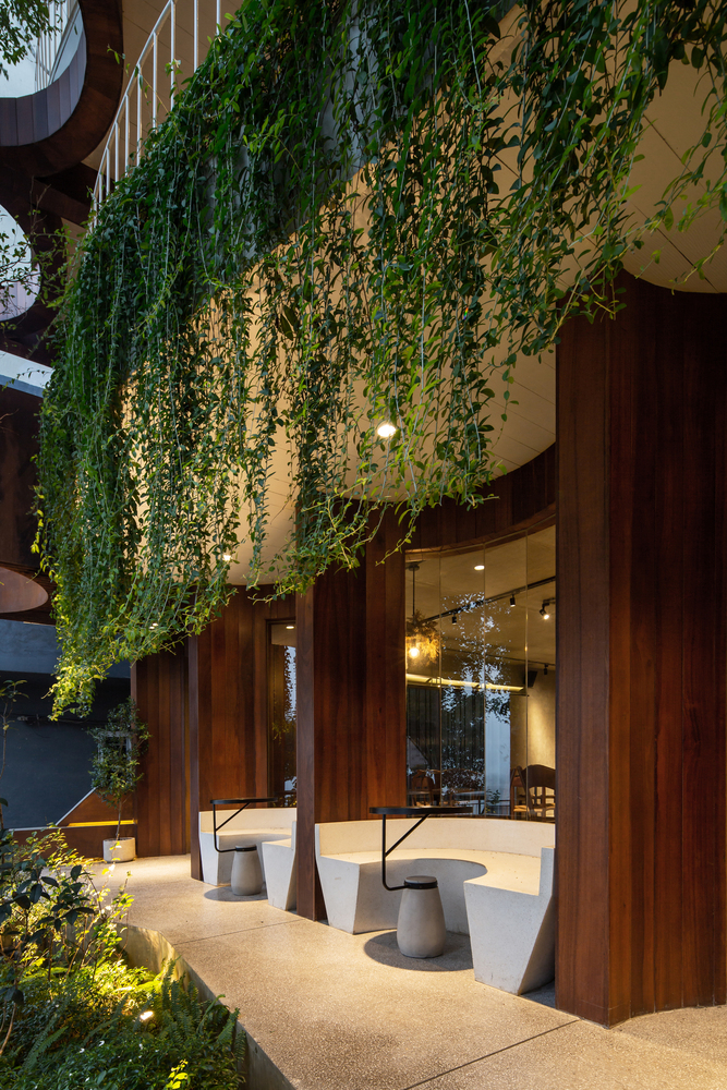 Điểm nhấn tại mặt tiền là cấu trúc vòm cong bằng gỗ tạo nên ranh giới thú vị giữa không gian bên trong và bên ngoài, nơi mà các không gian sân trong được định hình thành nhiều cụm, mang lại sự riêng tư và cởi mở về cảnh quan cho nhiều nhóm khách hàng khác nhau.