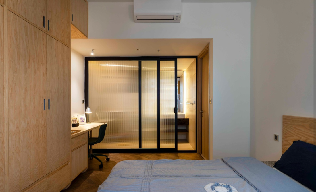 Phòng ngủ Master thiết kế đơn giản, ngăn cách phòng tắm là lớp kính trượt mờ.