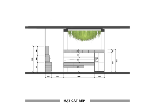 Đặc biệt, mảng xanh được đưa vào căn bếp một cách khéo léo, cân bằng giữa sự hiện đại và hơi thở của thiên nhiên. Bằng công nghệ tiên tiến nhất, trần nhà được phủ bởi một mảng xanh với những cây cúc tần Ấn Độ rũ xuống - một sự hoà quyện đầy cảm hứng. Cây xanh còn lan toả ra các mảng tường, đem đến sinh khí lan toả khắp căn bếp.