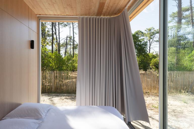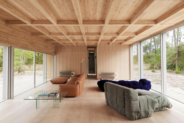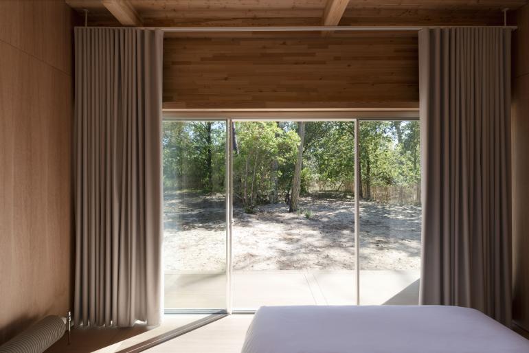 Nó được thiết kế hòa mình với thiên nhiên, cửa được mở lớn từ trần xuống sàn giúp căn nhà trở nên thoáng rộng, đồng thời khi cửa mở sẽ có sự giao thoa giữa trong và ngoài hòa quyện lẫn nhau.