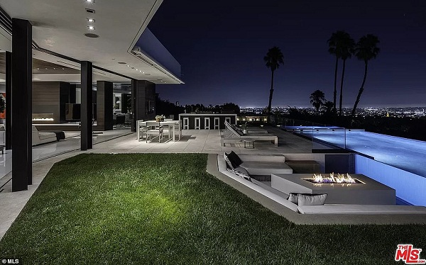 Hồ bơi vô cực, vài cây cọ xanh, bàn ăn ngoài trời, khu vực thư giãn bên lò sưởi cùng với toàn cảnh thành phố Los Angeles về đêm đã tạo ra một không gian thư giãn tuyệt vời cho gia đình.