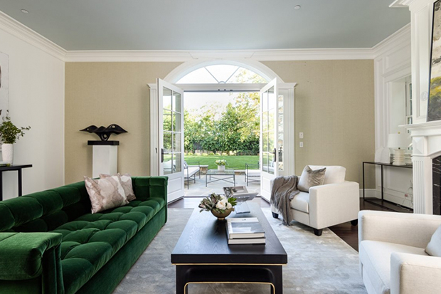 Không gian sống rộng lớn và ấm cúng này tràn ngập ánh sáng tự nhiên và dễ dàng tiếp cận sân sau thông qua ba cánh cửa đôi kiểu Pháp.
