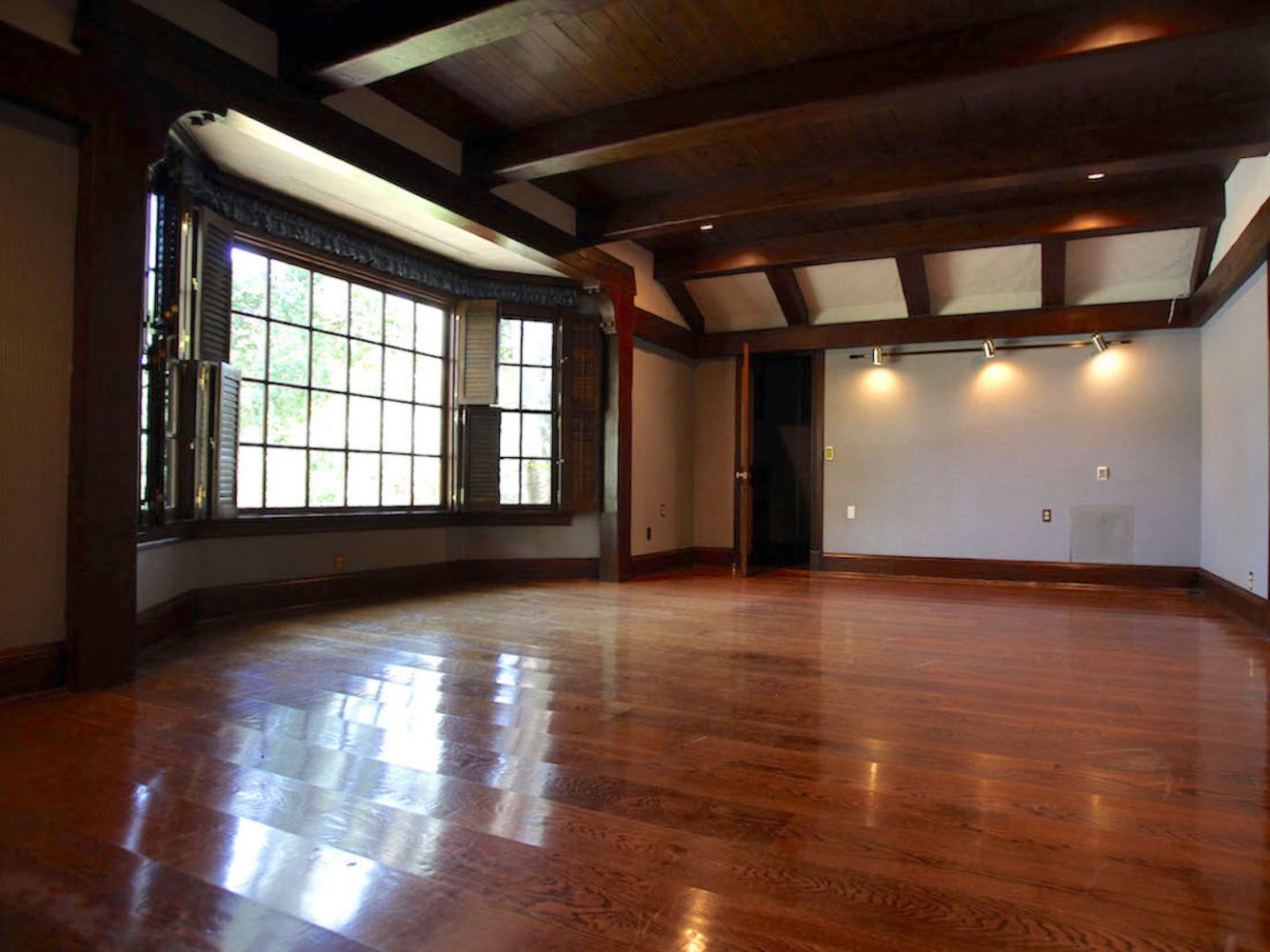 Phòng ngủ chính thông thoáng rộng lớn được lát bằng gỗ sồi.