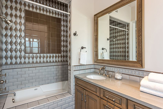 Gương mở rộng và gạch khảm thêm một điểm nhấn thú vị cho phòng tắm dành cho khách này.