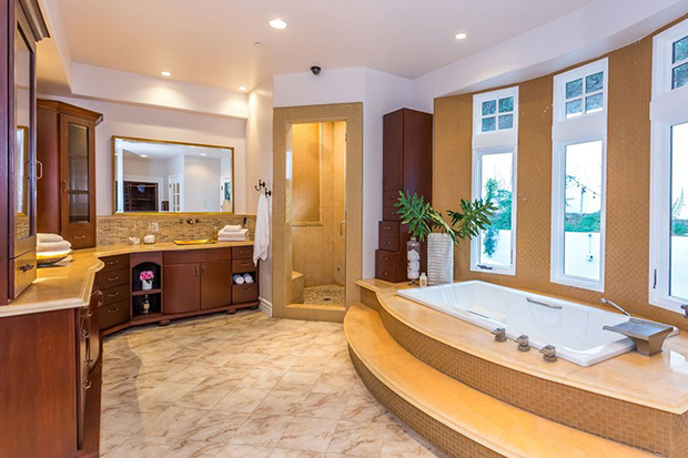 Phòng tắm sang trọng đầy đủ tiện nghi, chủ nhân thoải mái ngâm mình trong bồn tắm kiểu bể sục.