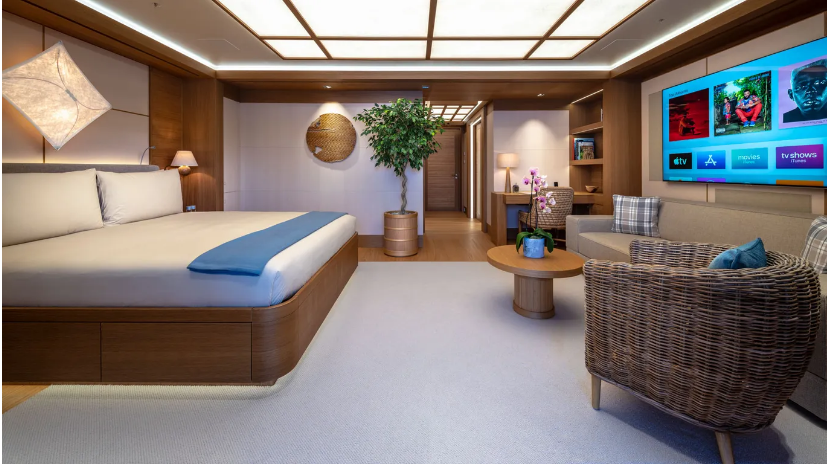 Trang trí và kích thước của các cabin khách rộng rãi, mỗi cabin được hoàn thiện với khu vực phòng khách riêng và phòng ngủ riêng, gần như giống hệt nhau và đi theo hành lang chính trung tâm ngay phía sau sẽ là nơi hồ bơi và trung tâm điều trị đang đợi sẵn.