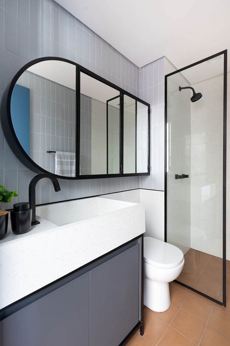 Phòng tắm đầy phong cách với màu trắng, xám và chiếc gương hiện đại.