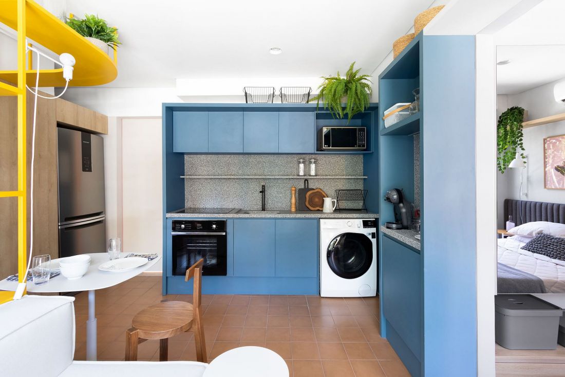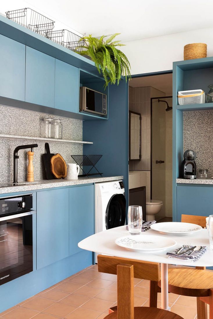 Tủ màu xanh tùy chỉnh kết hợp với bàn đá granit mang lại sự hiện đại, tinh tế trong căn bếp tiết kiệm không gian này.