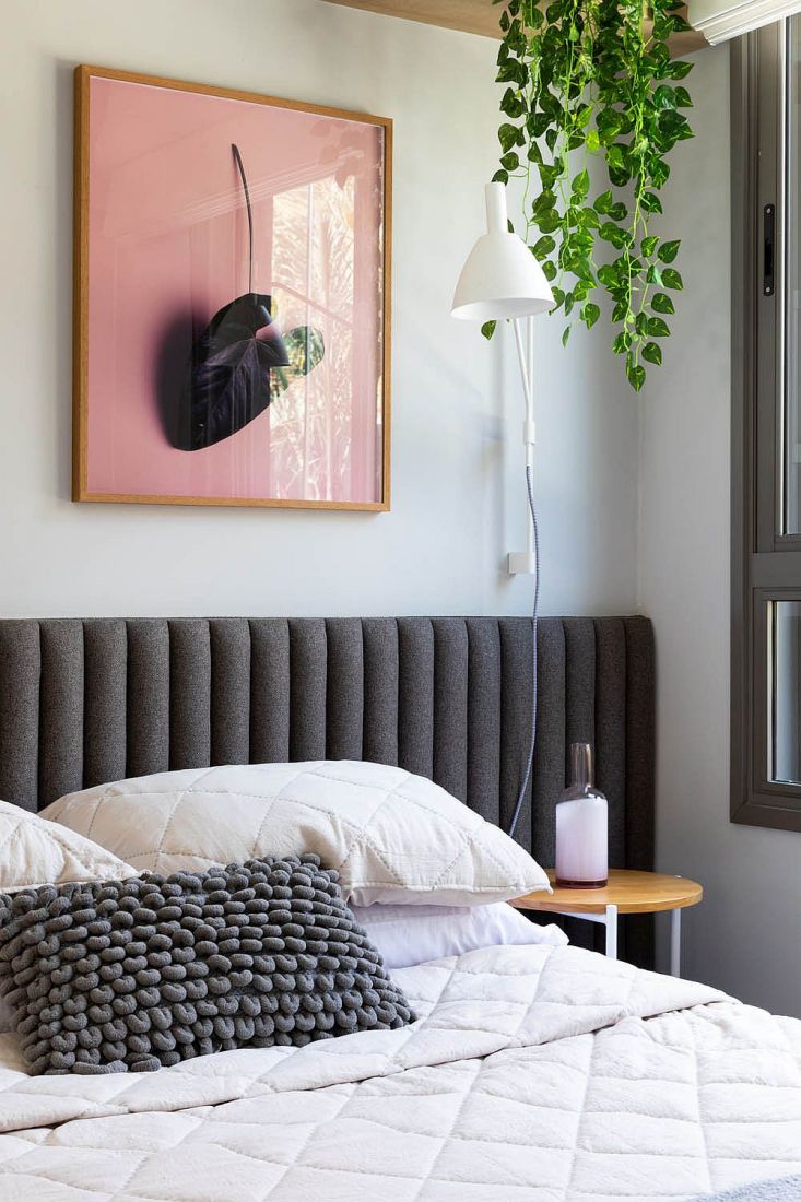Nhà thiết kế vẫn không quên mang thiên nhiên vào phòng ngủ với hình thức cây dây leo và tranh thực vật để tạo nên một không gian tươi mới, trong lành và ngập tràn sức sống.