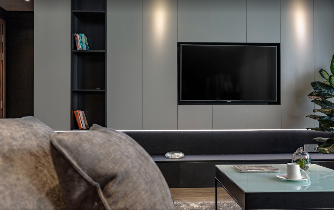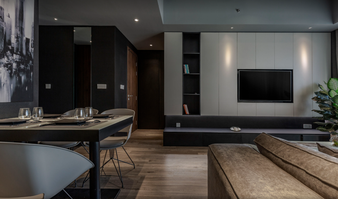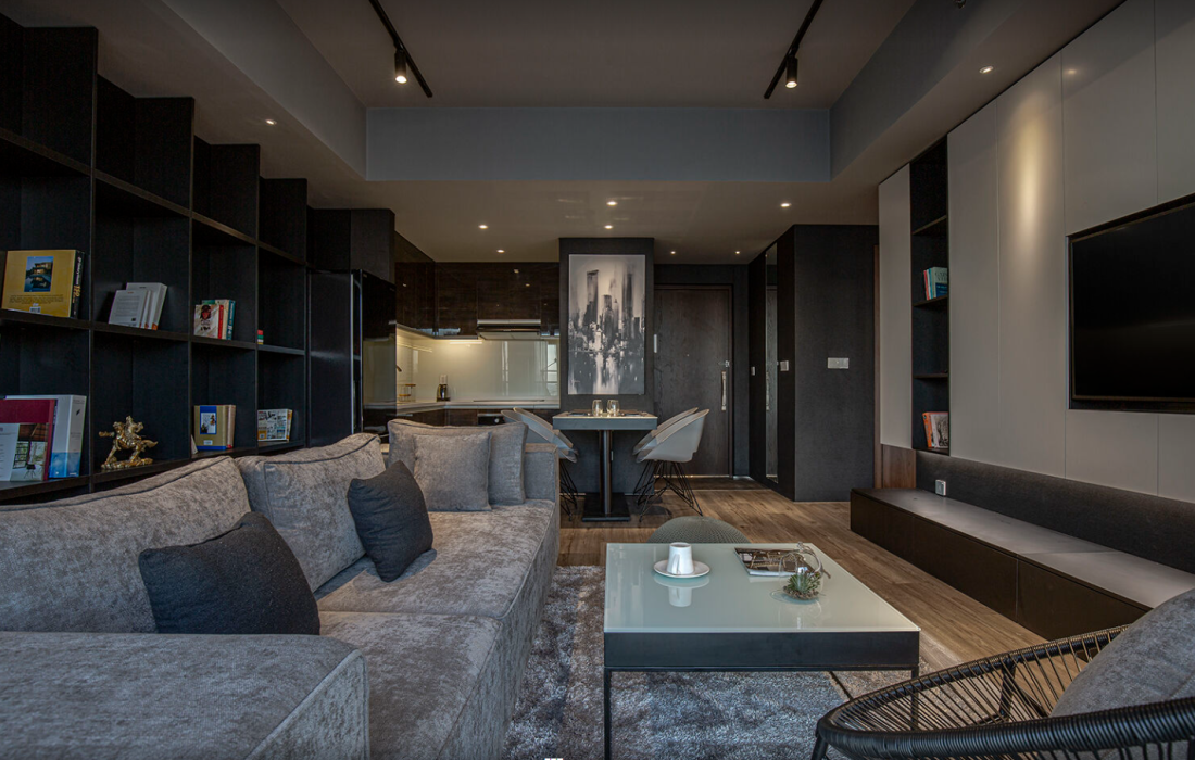 Ánh sáng trong căn hộ được tính toán một cách khoa học. Ánh sáng được tập trung vào những khu vực sử dụng chính, trong khi phần còn lại của không gian chỉ có ánh sáng dịu nhẹ, tạo cảm giác thư giãn tuyệt đối. Hiệu ứng giao thoa giữa tông màu tối và ánh sáng đã phá vỡ mọi điểm cuối, khiến không gian dường như được mở rộng hơn rất nhiều so với thực tế.