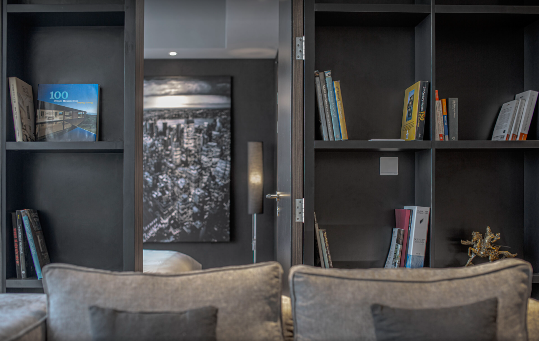 Hệ thống kệ sách và lưu trữ: Những chiếc kệ sách và hệ thống lưu trữ bao phủ toàn bộ các bức tường trong phòng. Chúng được kết nối với nội thất để tạo nên một luồng di chuyển hợp lý, giúp không gian không bị cảm giác chật chội. Sách không chỉ được cất giữ mà còn trở thành một phần của thiết kế, tạo nên vẻ đẹp riêng biệt.