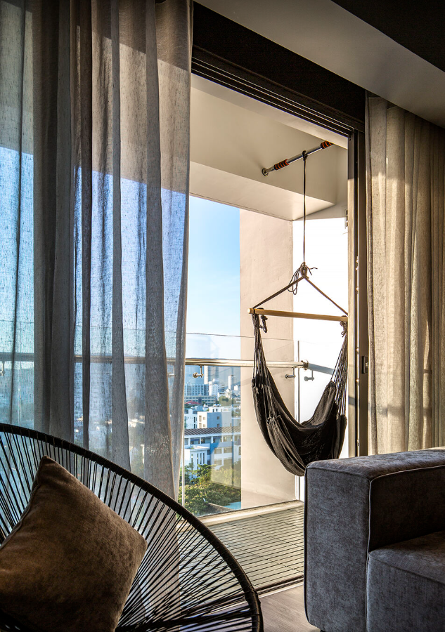 Ban công thư giãn: Một góc nhỏ ban công được tận dụng để đặt một chiếc ghế bành thoải mái, nơi gia chủ có thể vừa đọc sách, vừa ngắm nhìn khung cảnh bên ngoài. Ánh sáng tự nhiên từ ban công tràn vào, tạo nên một sự tương phản thú vị với không gian bên trong.
