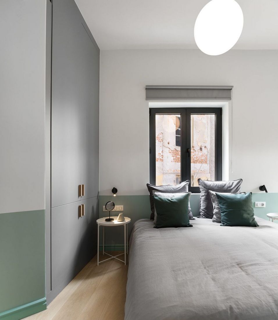 Một thế giới hoàn toàn khác khi bước vào phòng ngủ với màu xám nhạt và trắng.