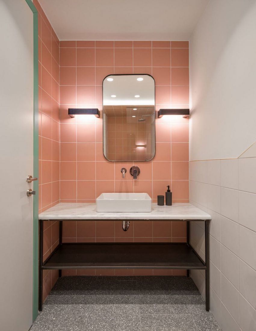 Phòng tắm hiện đại với màu hồng nhạt trở nên nổi bật và hấp dẫn. Một chiếc kệ lưu trữ lớn giúp không gian gọn gàng và tinh tế.