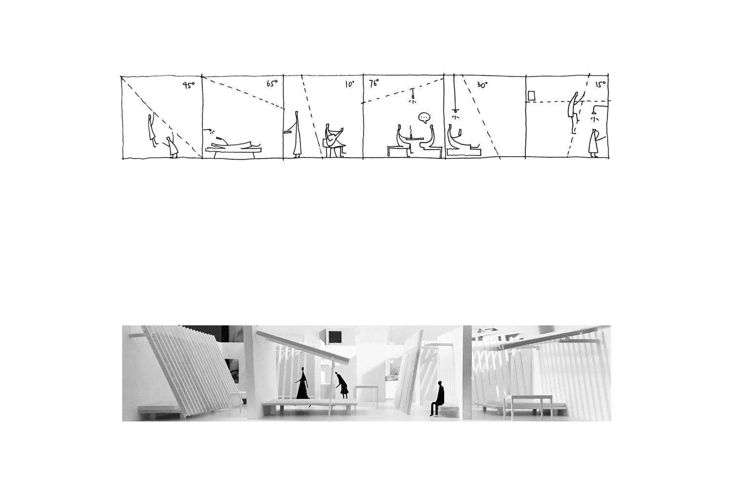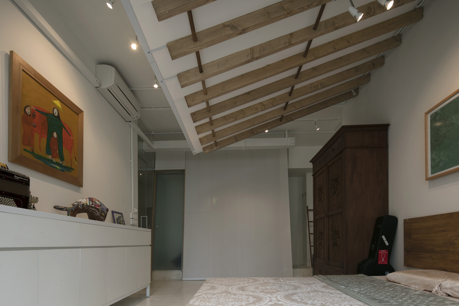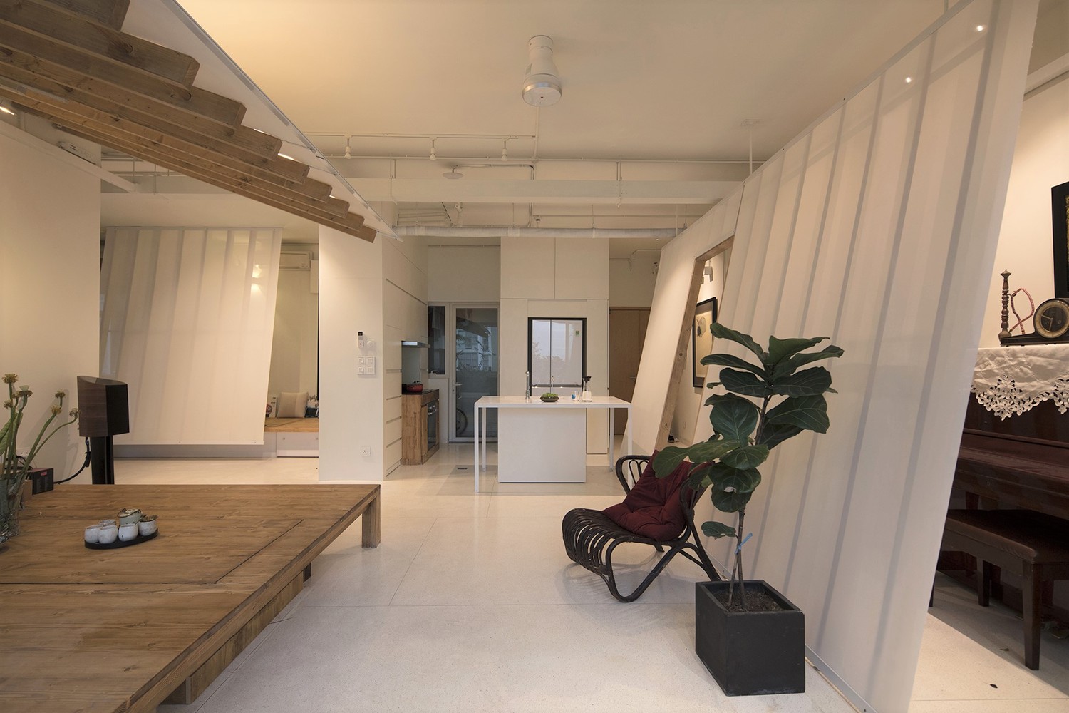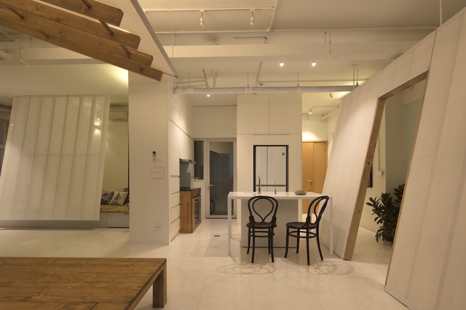 Tường, sàn và trần đã được hoàn thiện bằng sơn và gạch màu trắng. Trong không gian đó, kiến trúc sư đã xây dựng một hệ mái có cấu trúc nghiêng với độ dốc và kích thước khác nhau tùy thuộc vào góc và khoảng cách với các bức tường, mỗi mái nghiêng sẽ tạo ra một không gian linh hoạt tương ứng với chức năng cụ thể.