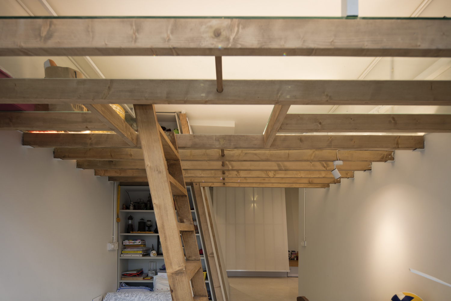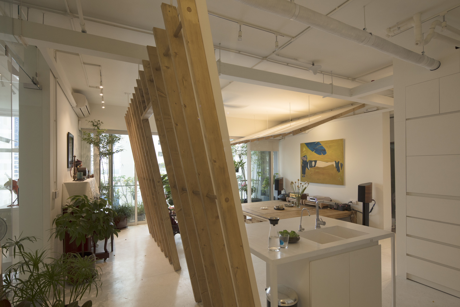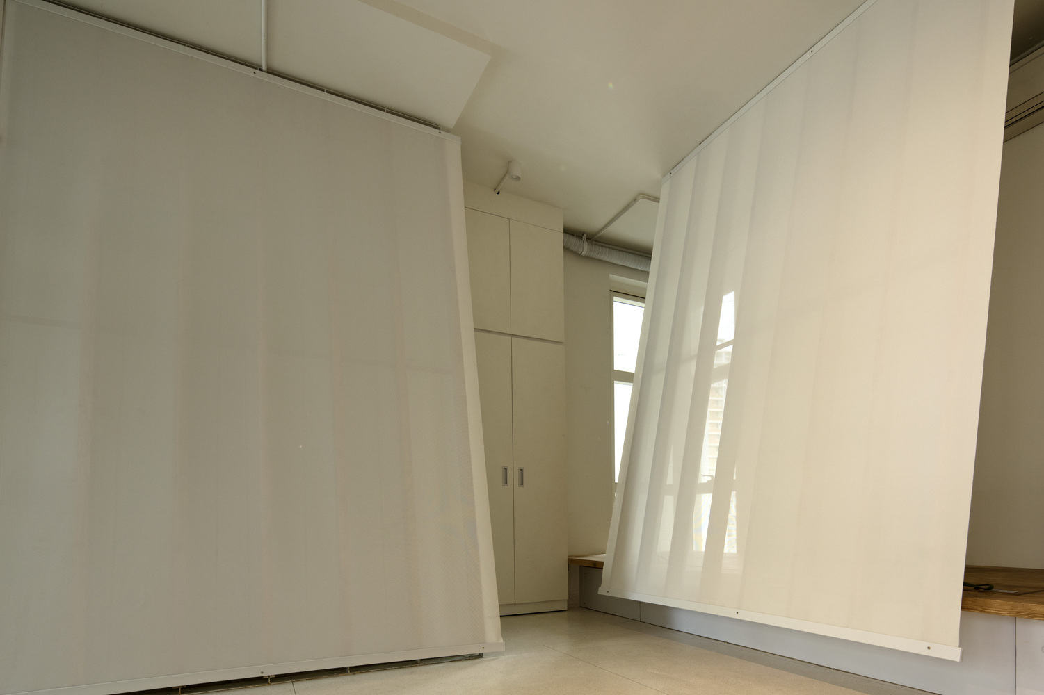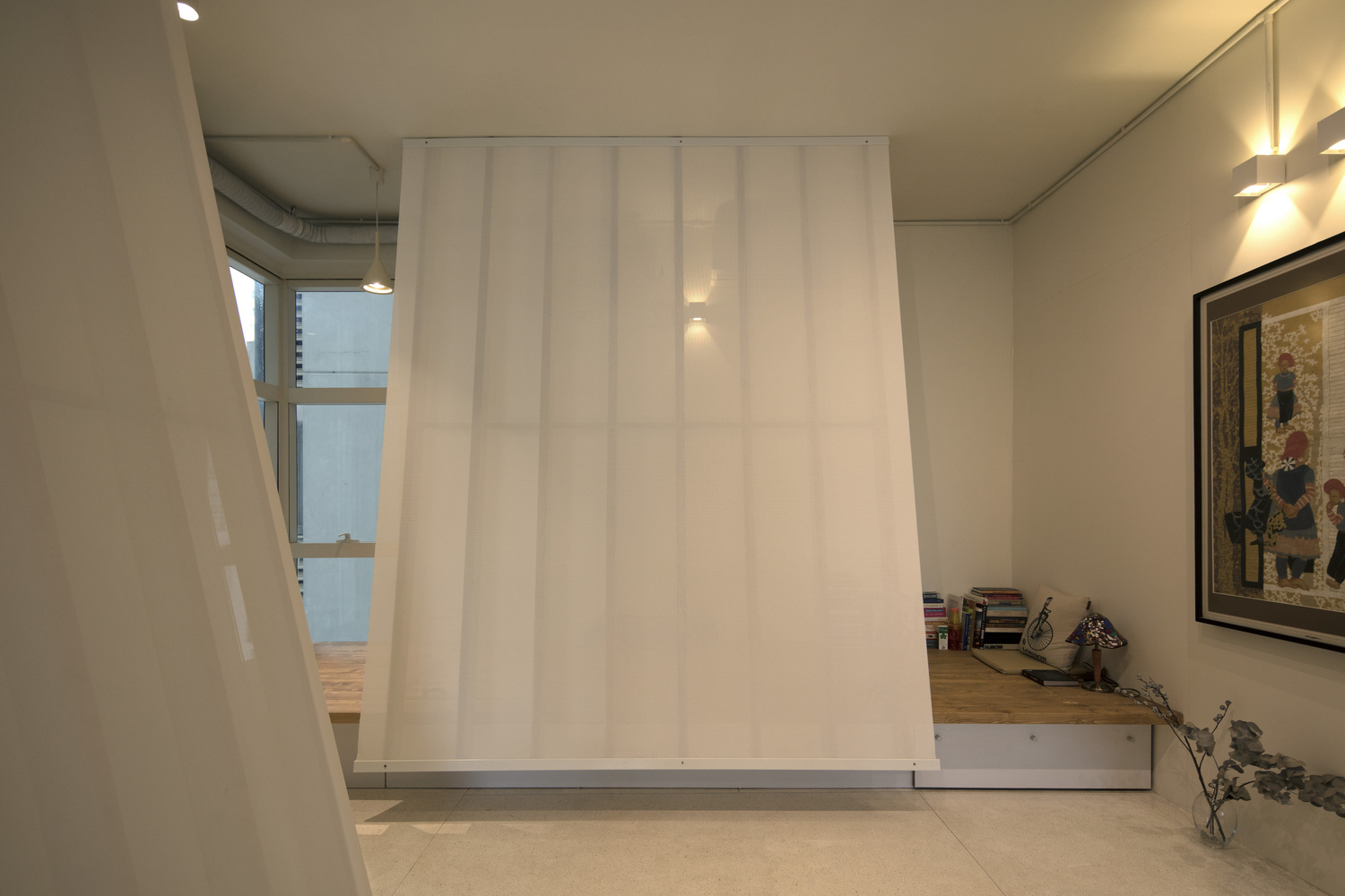 Tường, sàn và trần đã được hoàn thiện bằng sơn và gạch màu trắng. Trong không gian đó, kiến trúc sư đã xây dựng một hệ mái có cấu trúc nghiêng với độ dốc và kích thước khác nhau tùy thuộc vào góc và khoảng cách với các bức tường, mỗi mái nghiêng sẽ tạo ra một không gian linh hoạt tương ứng với chức năng cụ thể.