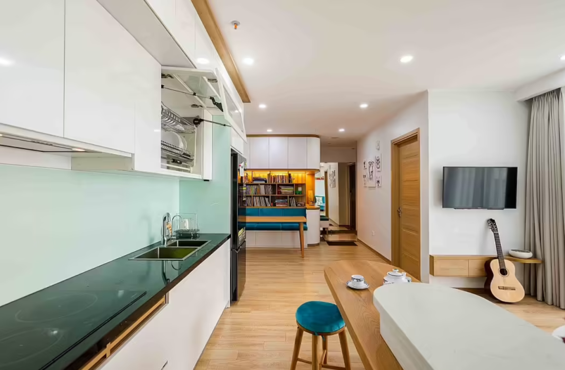 Bước vào căn hộ, bạn sẽ cảm nhận ngay sự thông thoáng nhờ khu vực bếp được thiết kế mở, kết nối trực tiếp với phòng khách và khu vực ăn uống. Đảo bếp đa năng: Đây chính là trung tâm của mọi hoạt động. Đảo bếp không chỉ là nơi nấu nướng, ăn uống mà còn là điểm tụ họp để trò chuyện.