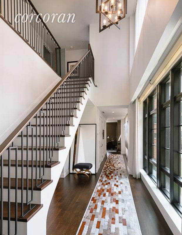 Hành lang dài với cửa sổ kính suốt từ trần đến sàn đóng vai trò như lối vào và dẫn đến một cầu thang hiện đại.