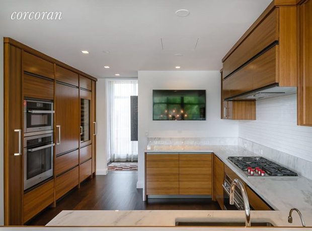 Tủ gỗ ấm áp với backsplash trắng và quầy bar đá cẩm thạch trong nhà bếp, trong khi TV treo tường giúp chủ nhân có thể giải trí trong khi nấu nướng.
