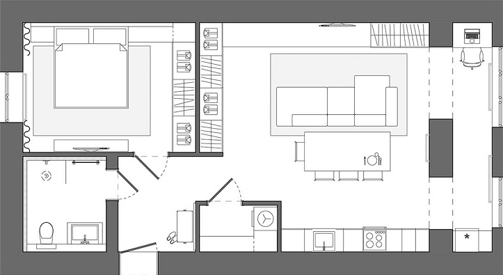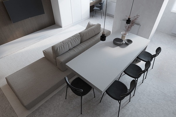 Chiếc ghế sofa nhạt được đặt hướng quay lại với không gian bếp, đây là chủ ý của gia chủ nhằm tối ưu hóa không gian.