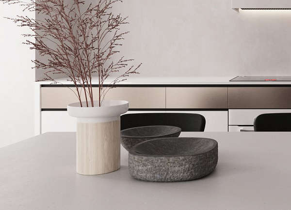 Khá thú vị và lạ mắt với những chiếc bát đựng trái cây, đi kèm lọ hoa giúp không gian thêm phần sinh động, cuốn hút.