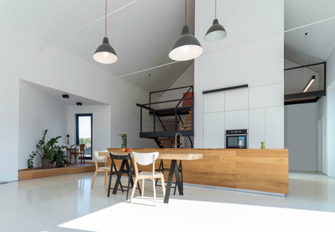 Căn bếp được ngăn ra thành khu riêng biệt bằng bàn bar phù hợp với nội thất khu vực ăn uống.