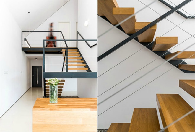 Theo các bậc cầu thang thanh thoát, bạn sẽ bước lên tầng lửng của ngôi nhà.