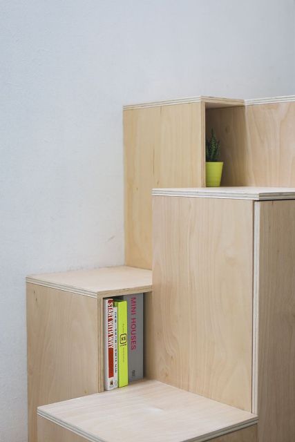 Ẩn chứa bên trong cầu thang là những góc lưu trữ đồ đạc. Thay vì làm một chiếc cầu thang dài, thì nó đã được thiết kế thành cầu thang đối xứng để tận dụng khoảng không gian bên dưới vừa đủ đặt một chiếc giường.