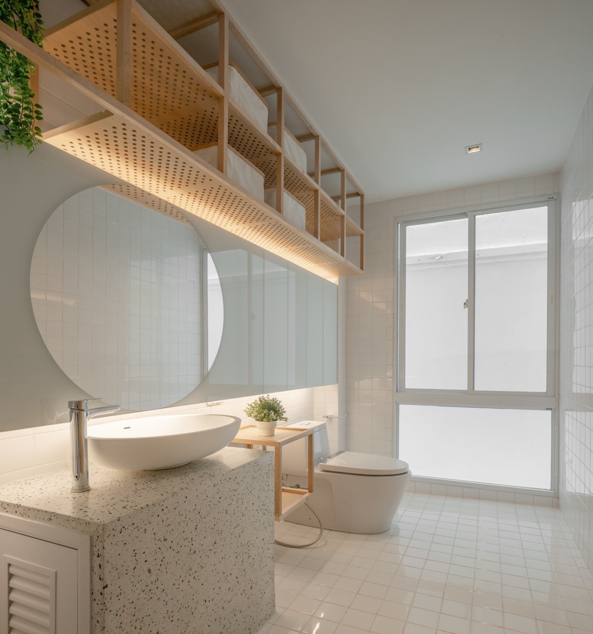 Phòng tắm tối giản theo tông màu xám và trắng, với một số tông màu gỗ làm tăng nhiệt độ thị giác.