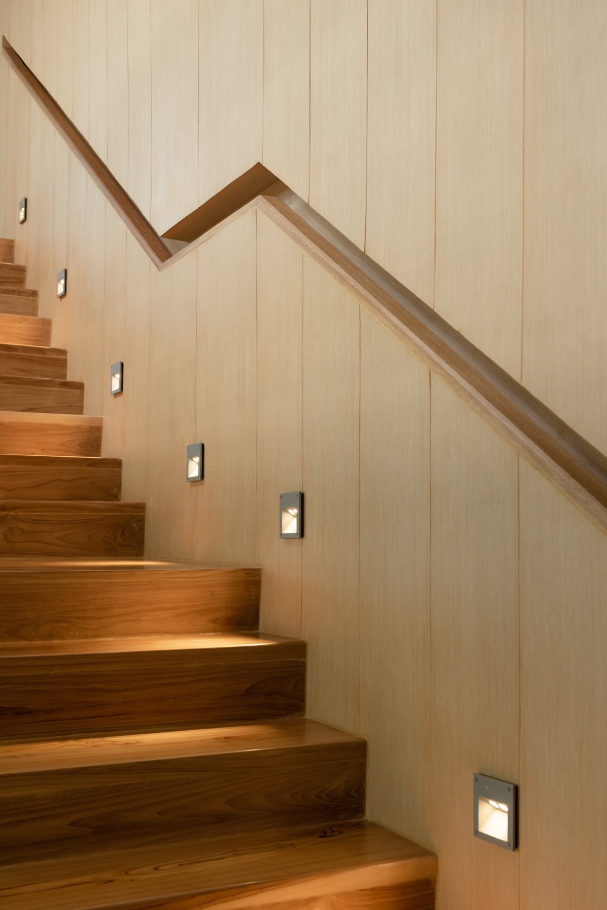 Đèn LED leo dọc theo các thanh gỗ của thiết kế cầu thang hiện đại.
