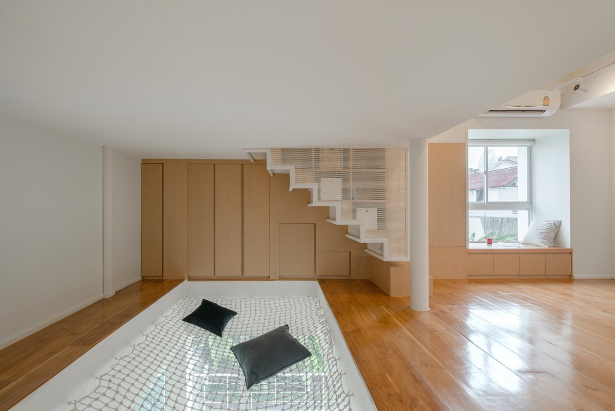 Có một đường cắt trên trần phòng khách hỗ trợ khu vực võng vui nhộn, kết nối tầng này và cư dân của nó với những người ở trên nó.