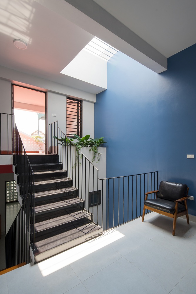 Bên trên là giếng trời thoáng đãng giúp căn nhà luôn tràn ngập ánh nắng tự nhiên và gió trời.