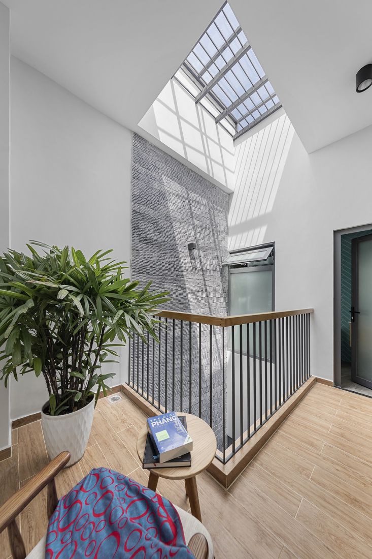 Không gian được bổ sung các ô thông tầng, tạo thông thoáng, tăng cường gió và ánh sáng cho hành lang giữa nhà.