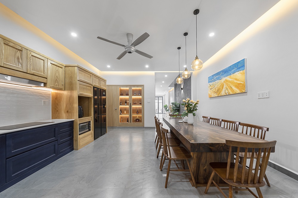 Khu vực bếp với đồ nội thất và hệ thống đèn tạo không gian thêm ấm áp.