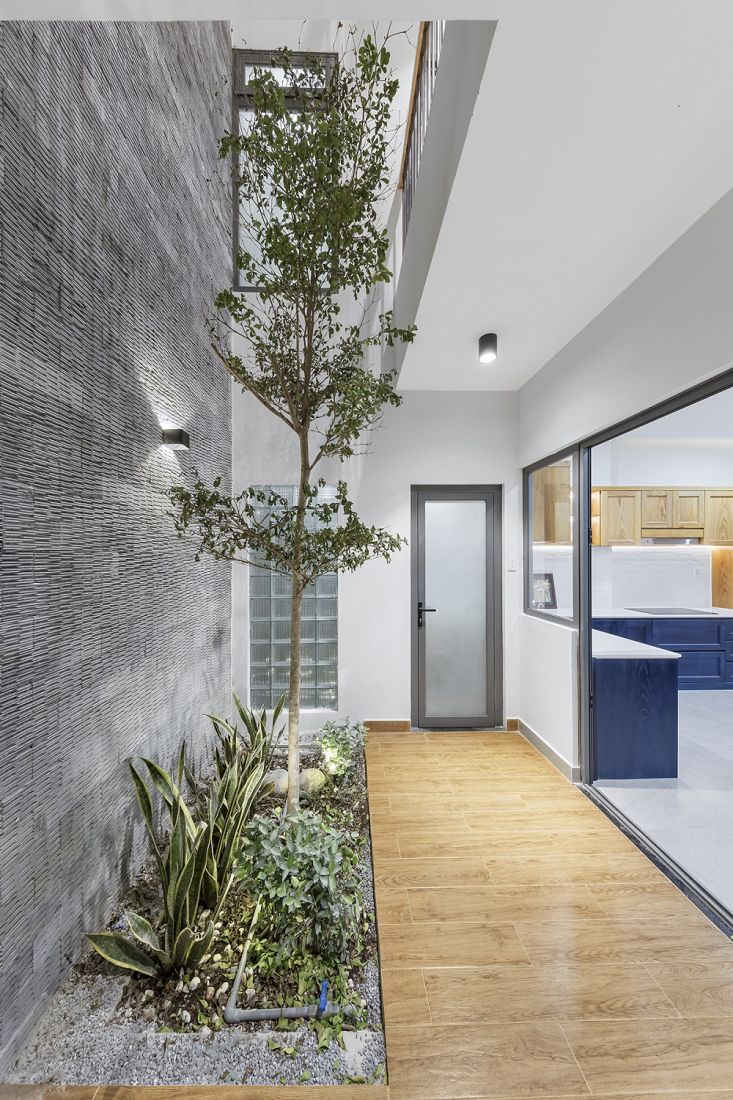 Cây xanh được trồng len lỏi vào từng không gian bên trong nhà: ở giếng trời, hành lang, sân trong, ban công và sân thượng phía trước. Giúp gia chủ cảm nhận được sự xanh mát ở khắp nơi.
