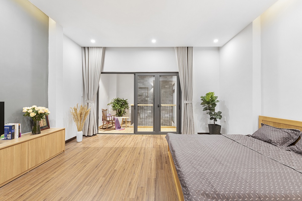 Phòng ngủ được đẩy lùi vào trong, giếng trời kết hợp cùng khu vệ sinh thành 1 khoảng không gian thoáng đãng, nhiều ánh sáng và gió.